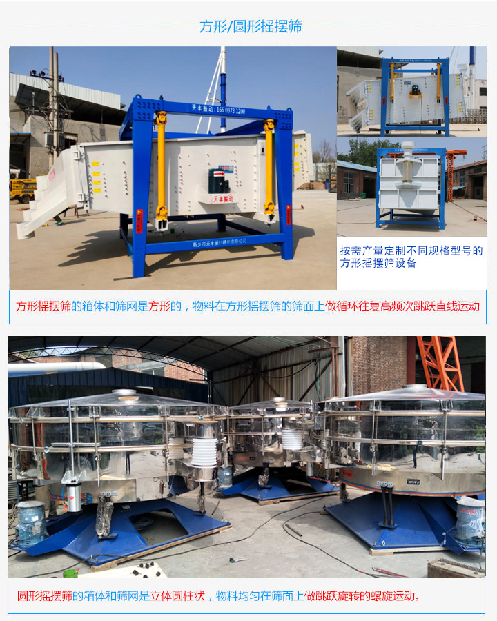 方形搖擺篩的箱體和篩網(wǎng)是方形的,圓形搖擺篩的箱體和篩網(wǎng)是立體圓柱狀的。